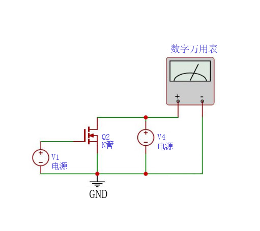 4、V4通电,V1 通电,使 MOS 管导通,用万用表测MOS管DS 之间压降△VDS,